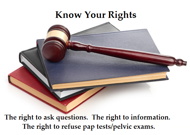 1. Let’s say, for the sake of argument, that a pap does extend life, exactly as they say (we know it doesn’t, but follow me here). It doesn’t change the fact that, as per the Patient’s Bill of Rights, a lucid patient always has the right to refuse any screening test or treatment, regardless if the refusal will shorten her life. And a non-lucid patient, in most jurisdictions, can only be forced to take treatment if he or she is a direct public health threat to others (for instance, a Department of Health can quarantine a TB patient); and then, only treatment that will mitigate that risk. Even then, the patient usually has the right to accept quarantine and refuse treatment. So whatever the excuse, women always, ALWAYS have a legal right to decide for themselves to refuse a pap or any other procedure.